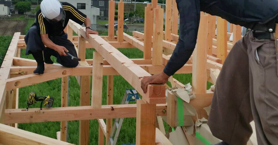 力自慢の若手の職人さんや経験や知識が豊富な熟練の職人さんなどが協力し合って、ほぼ一日で家の骨組みとなる部分を完成させていきます。